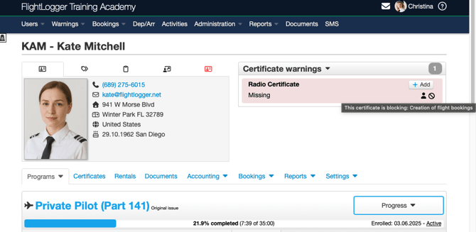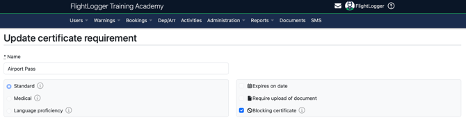 - The relevant Account setting for "Block if certificates are missing, expired, or requiring approval" is enabled for blocking of flight/theory registrations or bookings